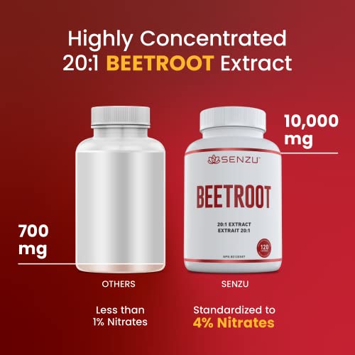 EXTRA STRENGTH: Experience the full potential of beetroot with our extra strength capsules. It provides a 20:1 extract that is equivalent to 10,000 mg of raw beetroot powder. Our formula is also standardized to 4% nitrates, outperforming other beetroot supplements with less than 1% nitrate content.