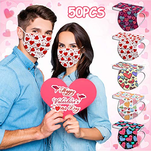 50Pcs Valentines Love Heart Màsk Disposable for Adult Holiday Màsk 3Ply Cute Colored Covering Universal Face Protection