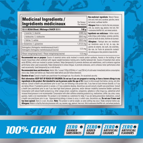 Specification: BCAA Powder with L Glutamine for Peak Performance, Muscle Development & Recovery, Icy Blue Razz Flavour, 100% Clean – No Artificial Flavours or Colours, Banned Substances or Added Sugar – 220g