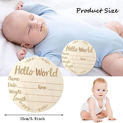 CAVLA Wooden Baby Announcement Sign, Newborn Baby Announcement Sign, 5.9 Inch Round Hello World Newborn Welcome Sign for Baby Shower, Photo Prop, Hospital, Nursery, New Parents (D)