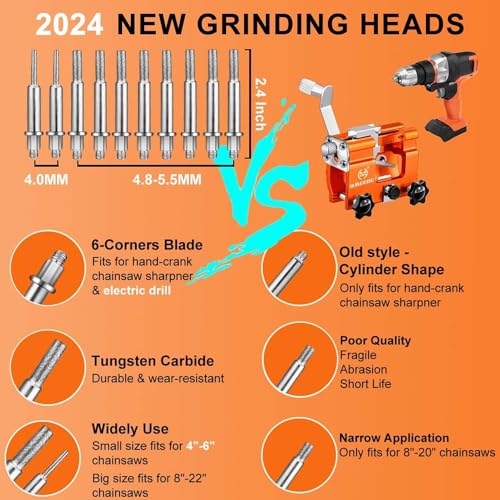 10PCS Tungsten Carbide Chainsaw Sharpener Burrs: The chain saw sharpening jig kit comes with 10 high-quality tungsten carbide sharpening burrs that offer exceptional hardness and superior wear resistance. With just a few seconds, this kit can effectively sharpen your chain saw, giving it a renewed appearance. Additionally, the chain saw sharpening burr is compatible not only with a hand crank but also with an electric drill, adding to its versatility.