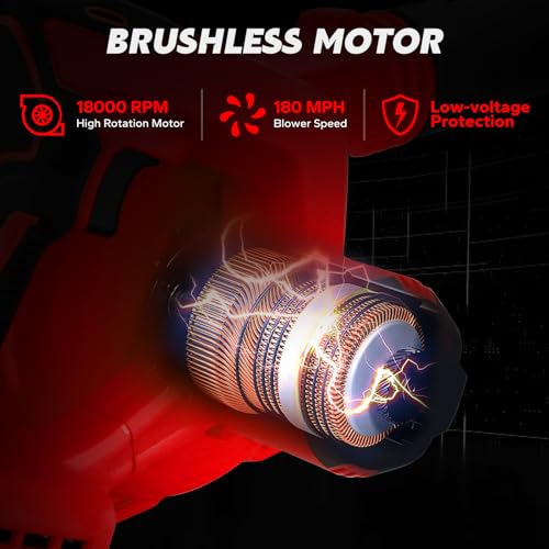 【6 Adjustable Speeds】This cordless leaf blower has six adjustable speeds. It can reach up to 180MPH. Equipped with a high-efficiency brushless motor with a speed of up to 18,000RPM, it has a powerful wind speed and higher performance.