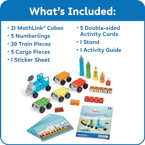 PLAY FIGURE PLAYSETS: This set includes 21 MathLink Cubes, 5 Numberlings, 30 Train Pieces, 5 Cargo Pieces, 1 Sticker Sheet, 5 Double-sided Activity, Cards with 1 Stand, 1 Activity Guide