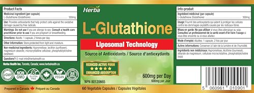 Specification: Herba Liposomal Glutathione Supplement – 600mg Per Day | 60 Vegetable Capsules | L-Glutathione Reduced Active Form with Liposomal Delivery Technology | Source of Antioxidants | NPN from Health Canada