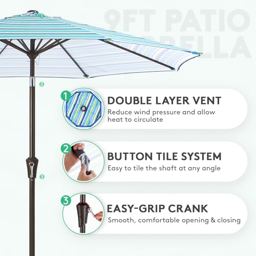 Specification: JEAREY 9FT Outdoor Patio Umbrella with Push Button Tilt and Crank, Outdoor Table Umbrella 8 Sturdy Ribs UV Protection Waterproof for Garden, Deck, Backyard, Pool (Blue&Green Stripe)