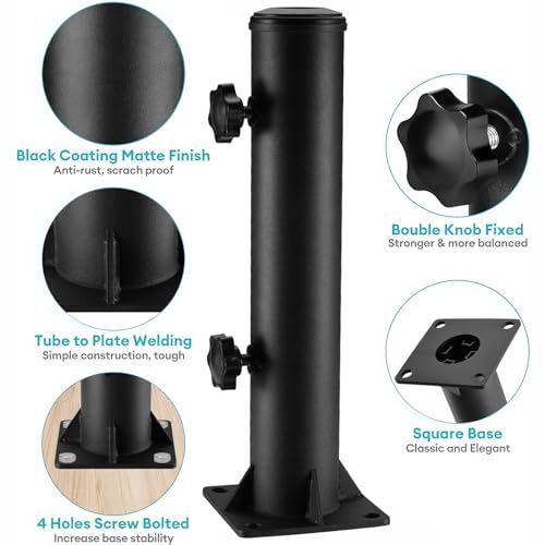 Specification: Lalafancy Patio Umbrella Base Stand 4″ Square Table Umbrella Holder Outdoor Deck Umbrella Mount Double Hand Turn Knob Fitting φ1 1/4″-1 9/10″ Poles for Patio Table, Balcony, Decks, Docks, Backyard