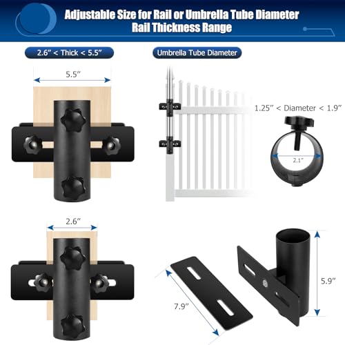 Adjustment Range: The railing umbrella holder accommodates umbrella pole with diameters ranging from 1.25 “≤Diameter≤1.9, The vertical railing grille or pillar thickness range should range from 2.6 “≤Thick≤ 5.5”. The umbrella clamp for deck allowing you to adjust the size to fit different sizes of front porch rails.