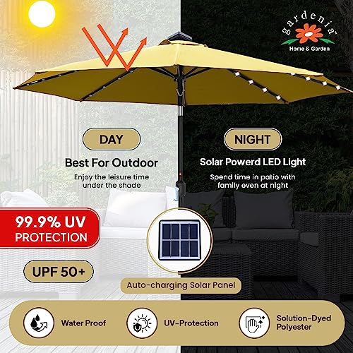 Enhance Your Outdoor Ambiance with the gardenia Home & Garden 10-foot umbrella with solar lights! These outdoor umbrellas with led lights are perfect for any patio set, bistro coffee table, or poolside area. They offer ample shade and enhance the ambiance of your outdoor space, creating a more inviting atmosphere. Moreover, these patio umbrellas with lights are designed to withstand strong winds and harsh weather conditions, featuring 8 sturdy steel ribs and a push-button tilt for easy adjustment. The metallic crank handle allows for easy opening and closing, making it effortless to enjoy the outdoors while staying protected from the sun. Suitable For Multiple Patio Tables, these led patio umbrellas are designed with a 38mm sturdy steel pole that fits most umbrella bases. For optimal stability, we recommend using a heavy umbrella base of 60 pounds or more (not included with the umbrella). Stay protected from harmful UV rays with our durable 220g polyester fabric of the led umbrella patios, featuring a fade resistance coating (fastness level 4) and 50+ UPF for over 99% protection against harmful UV rays, perfect for outdoor use. Meticulously Crafted To Withstand Strong Winds, gardenia Home & Garden led patio umbrellas feature innovative air vent technology, ensuring your umbrella remains stable. They’re perfect for any outdoor space, with easy storage and transportation features like a closure strap. However, avoiding the umbrella open during stormy weather is essential for safety.