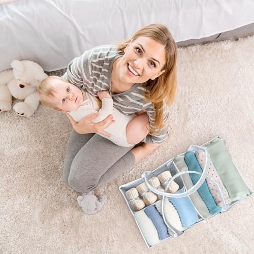 [STYLISH BABY ROOM DECOR ITEM]: The baby diaper caddy,a 15x9x7-inch storage basket organizer,offers ample space.This versatile nursery organizer,diaper stacker,and diaper caddy come with 2 removable dividers that can create 3 compartments,along with 8 external pockets that can be transformed into any organizer basket.The baby basket can hold all the newborn essentials you need within easy reach,baby shower gifts