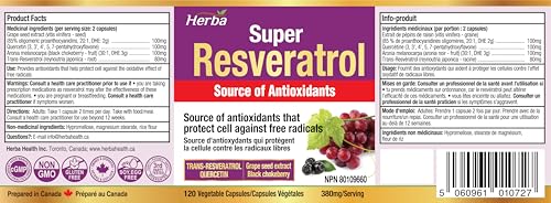 Specification: Resveratrol Supplement Canada – 120 Capsules | >98% Trans-Resveratrol with Quercetin, Echinacea, Grape Seed Extract, and Aronia | Powerful Antioxidant Supplement | Made in Canada | Herba
