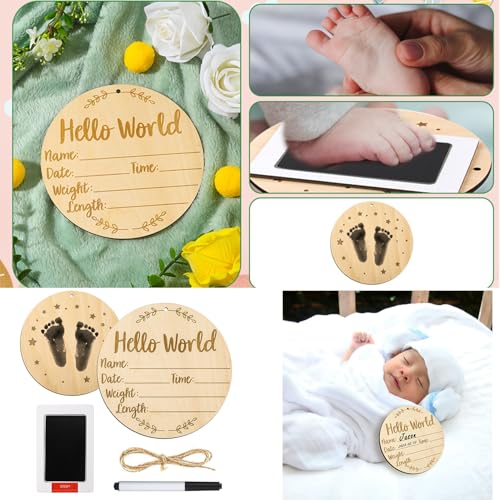 Specification: Suweiyuanshiyi Baby Announcement Sign, 5.9in Round Hello World Baby Name Plaque with Ink Pad for Baby Hand and Footprints Wooden Newborn Sign for Photo Prop