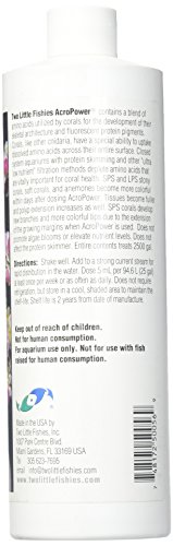 Two Little Fishies` new formula supplies amino acids that corals need to build their skeletal architecture. Corals, like other cnidaria, have a special ability to uptake dissolved amino acids across their entire surface. Closed system aquariums with protein skimming and other ULN (ultra-low nutrient) filtration methods deplete amino acids that are vitally important for coral health. Corals become more colorful within days due to the extension of the growing margins when AcroPower is used.
