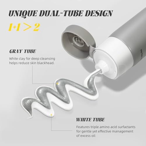 【Dual-Tube Facial Cleanser】White tube is amino acid facial cleanser, gentle cleansing for daily use; Gray tube is clean mud film, cleans pores and dirt, reduces blackheads. The Cleaning power is 1+1>2