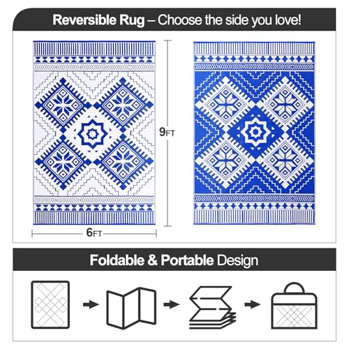 Specification: Waterproof Outdoor Rug 6x9ft, Boho Reversible Plastic Straw Mat for Patio RV Deck Porch Backyard Balcony Camping Picnic Beach Indoor Outdoor Carpet, Blue&White