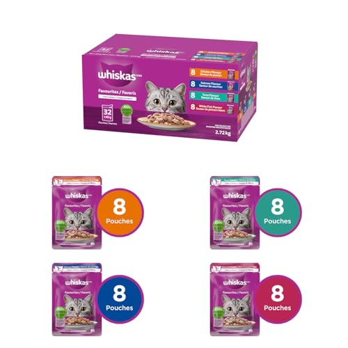 Contains one (1) 32-count of 85g pouch of WHISKAS FAVOURITES Adult Wet Cat Food Cuts in Gravy Variety Pack (8) Chicken Flavour (8) Salmon Flavour (8) Tuna Flavour (8) White Fish Flavour