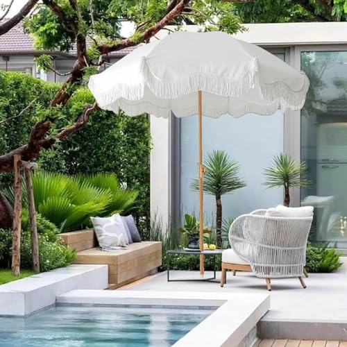 Specification: White Outdoor Umbrella with Fringe 6.5ft Boho Beach Umbrella for Travel Tilt Patio Umbrella Portable Sunshade Umbrellas UPF50+ Holiday Umbrella Beach Parasol for Garden Lawn Yard Pool